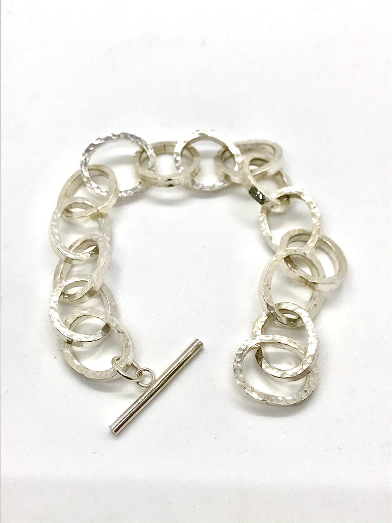 Solid silver hammered link braclet with T-Bar Catch